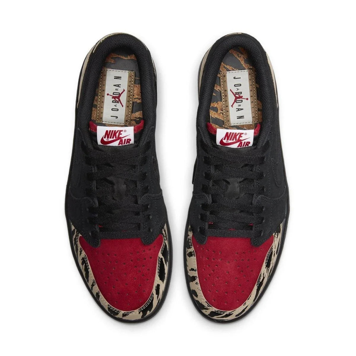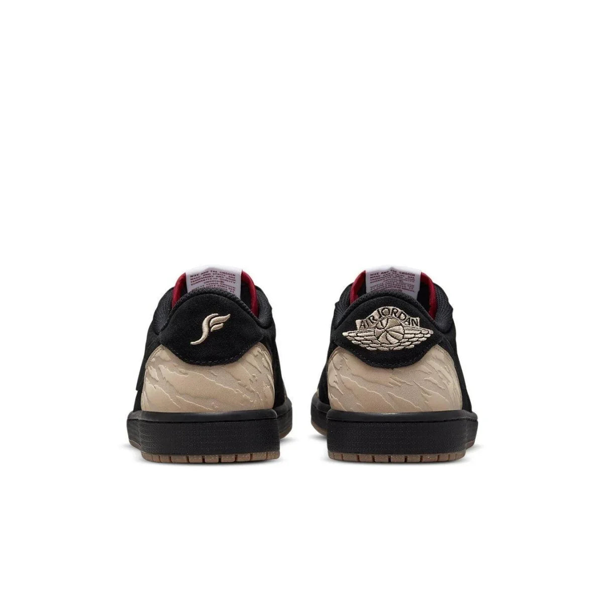 The SoleFly x Air Jordan 1 Low Retro OG SP "Everglades," created in collaboration with the Miami-based sneaker retailer, updates the iconic style with a stylized animal print. The pattern is applied to tan leather overlays on the forefoot and heel, the latter featuring a tonal execution and the former featuring a two-tone design. The upper features black suede on the side panel and scarlet suede on the toe. Each tongue is adorned with woven Nike Air labels, while mismatched heel tabs feature SoleFly branding on the left shoe and a Wings logo on the right. The shoe sits atop a black rubber midsole that's reinforced underfoot by a rubber outsole.