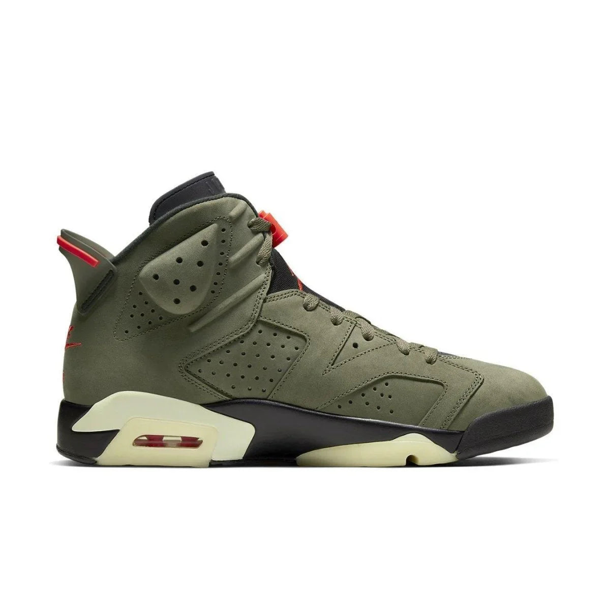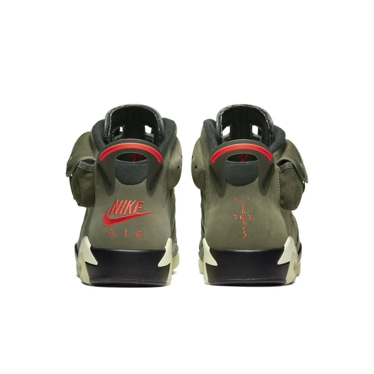 Following in the footsteps of the highly sought-after 'Olive' colorway from 2019, the Travis Scott x Air Jordan 6 Retro 'British Khaki' re-unites Jordan Brand with the Houston rapper. The upper is made of suede and canvas with Bright Crimson accents. The storage pocket reappears on the lateral collar, while new zippered detailing appears on the medial side. The heel of the left and right shoe bears mismatched Nike Air and Cactus Jack logos, with additional designs on the midsole, outsole, tongue, and lace lock.