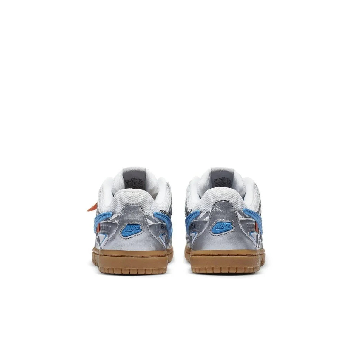 The Off-White x Nike Air Rubber Dunk 'University Blue', created in collaboration with Virgil Abloh's premium streetwear label, reimagines the vintage low-top with design features drawn from the lifestyle running space. This model features a P-6000-inspired white mesh upper with blue highlights and shiny silver overlays, as well as visible Air cushioning in the rubber cupsole. Virgil leaves his signature imprint on the Swoosh and Helvetica text outlined on the medial side panel with an orange pull tab.
