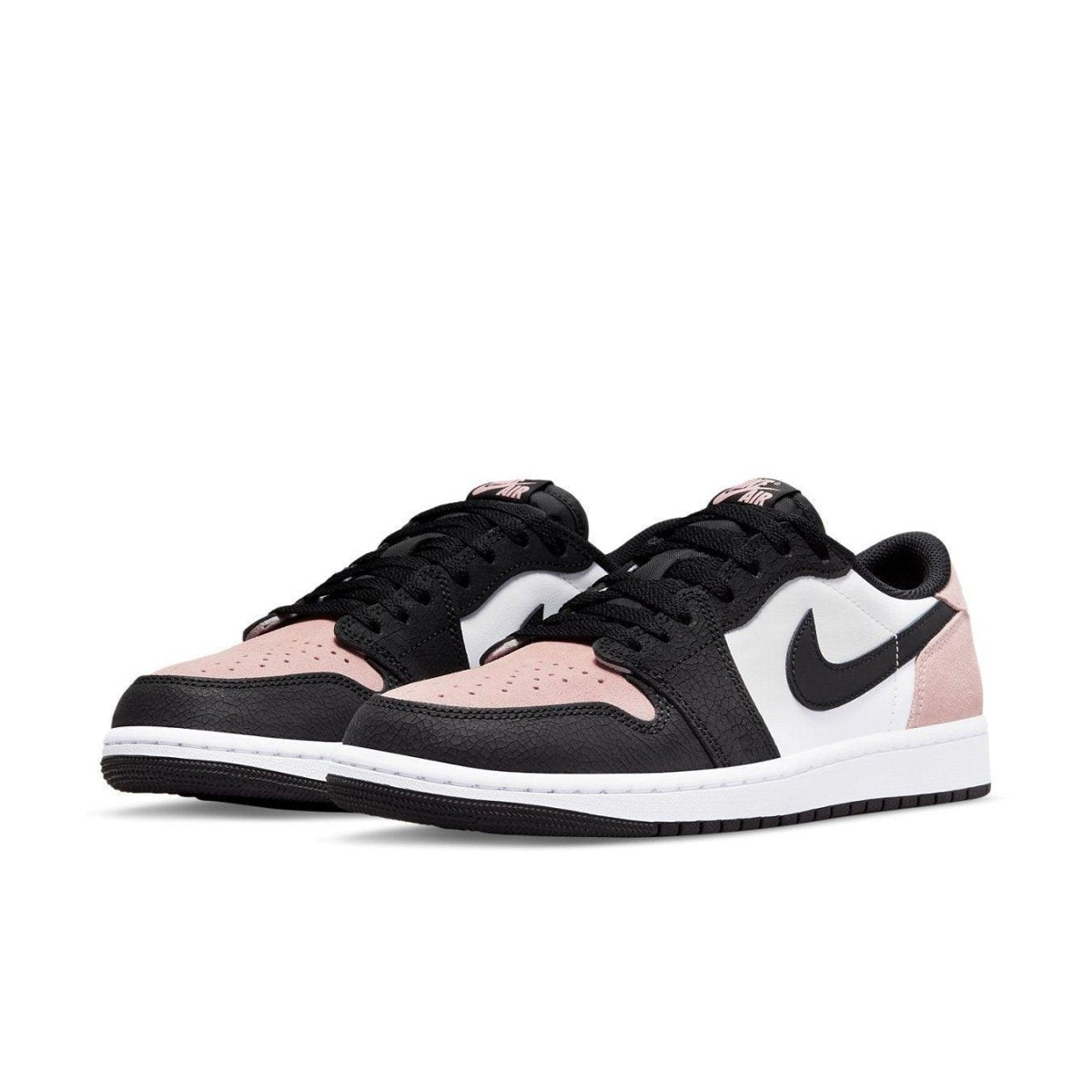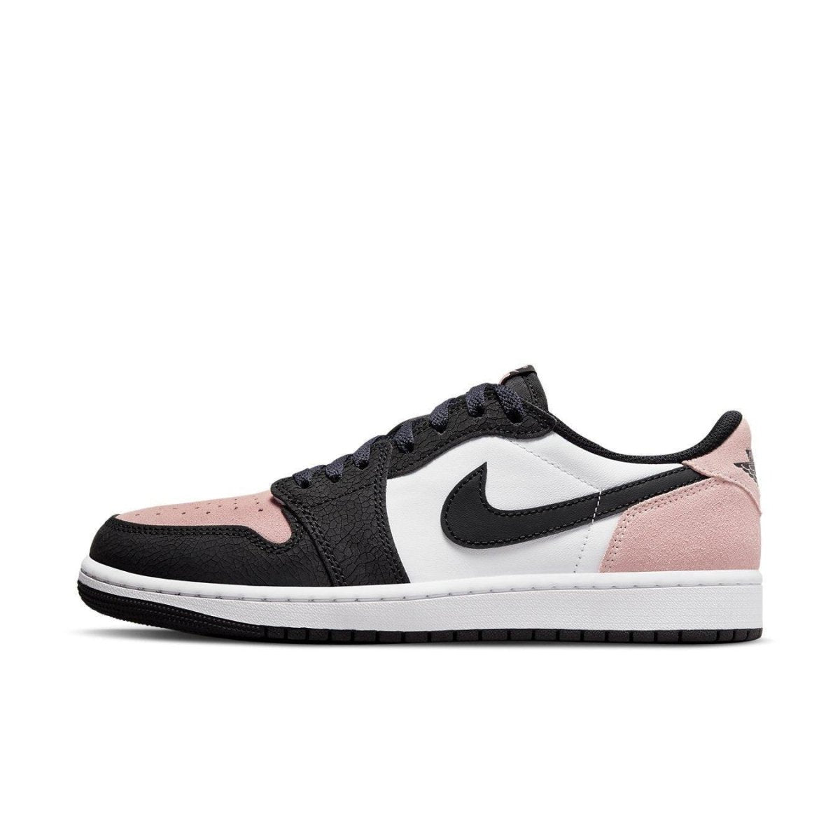 Rivestita con una combinazione di colori nero, corallo sbiancato e bianco, questa offerta di Air Jordan 1 Low è realizzata in un mix di pelle screpolata e liscia con strati esterni in pelle scamosciata. È dotata di un blocco "Black Toe" evidenziato con accenti contrastanti di corallo sbiancato. Un'intersuola bianca sopra una suola in gomma nera completa il design.