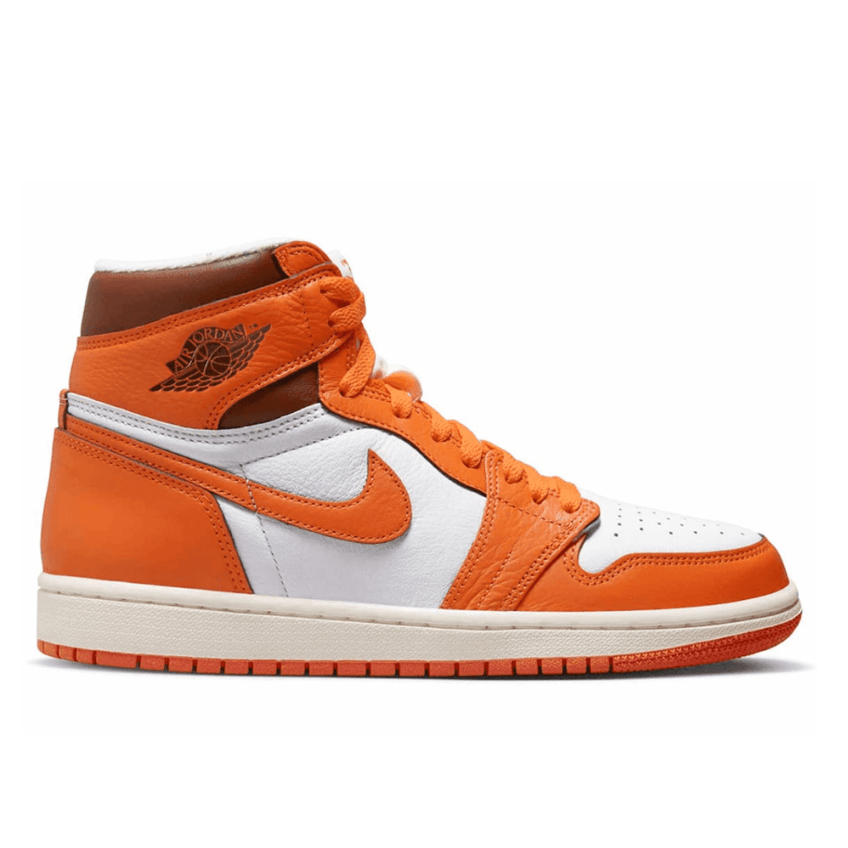 L'Air Jordan 1 High OG 'Starfish' da donna riporta la caratteristica tonalità immancabilmente legata alla colorazione 'Shattered Backboard' del 2015. La tomaia interamente in pelle presenta una base bianca, sovrapposizioni arancioni a contrasto e un colletto alto in marrone cioccolato . Un tag Nike Air intrecciato impreziosisce una linguetta in nylon leggermente imbottita con una finitura vintage bianco sporco. L'estetica invecchiata si ripete sull'intersuola in gomma, dotata di un'unità Air-sole incapsulata nel tallone e supportata sotto il piede da una suola in gomma arancione.