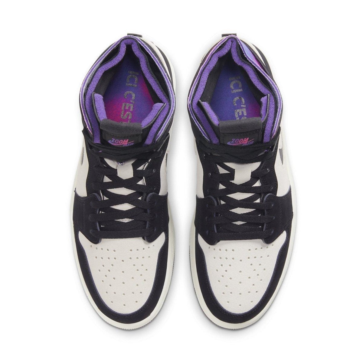 La Paris Saint-Germain x Air Jordan 1 High Zoom Comfort "Paris" ha vivaci bagliori di colore o una tavolozza di colori altrimenti neutra. La tomaia è realizzata in pelle scamosciata bianco sporco con sovrapposizioni in nabuk nero e una finitura iridescente riflettente sullo Swoosh fustellato. Il colletto decostruito e il tradizionale logo Wings sono un mix di toni fucsia e viola, con un'insegna circolare sul tallone che riconosce il PSG, la squadra di calcio professionistica francese. L'intersuola in schiuma fornisce un'ammortizzazione leggera, mentre l'ammortizzazione Zoom Air nel tallone è racchiusa in un supporto in gomma.
