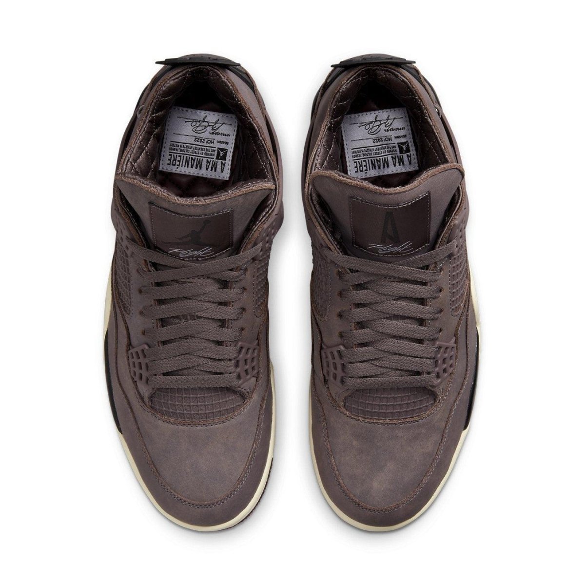 A Ma Maniére x Air Jordan 4 Retro "Violet Ore" offre una versione elevata della silhouette legacy. Il rivenditore con sede ad Atlanta riveste il mid-top con una tomaia in nabuk viola tenue, accentuata da una rete tono su tono e da un rivetto cromato decorativo incorporato nel colletto laterale. Le etichette in tessuto Flight sulla linguetta mostrano i marchi Jumpman e A Ma Maniére non corrispondenti, mentre le linguette nere sagomate sul tallone presentano un logo Nike Air in rilievo. Sul lato interno di ogni linguetta del tallone è incisa la frase "Non si tratta delle scarpe... si tratta di dove stai andando". Il tessuto trapuntato riveste il colletto e la soletta per una comoda vestibilità. La sneaker corre su un'intersuola in poliuretano color crema con ammortizzazione Air-sole visibile nel tallone.