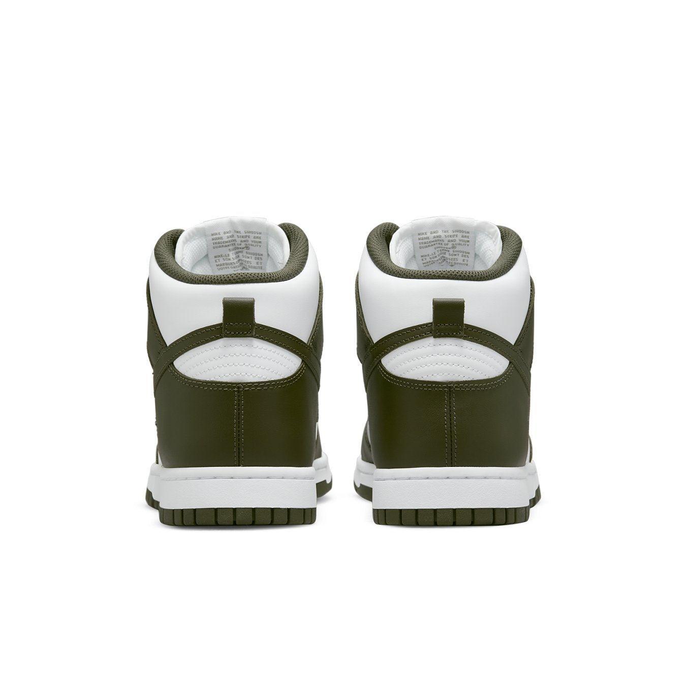 L'edizione 2022 delle Nike Dunk High "Cargo Khaki" presenta una classica colorazione bicolore ispirata alle scarpe da basket degli anni '80, originariamente sviluppate per il parquet universitario. La tomaia alta presenta una morbida pelle, con una base bianca con accenti verde oliva a contrasto. Presenta l'iconico Swoosh, la fodera del colletto in mesh e la sovrapposizione su avampiede e tallone. Un'etichetta Nike in tessuto impreziosisce la linguetta in nylon traspirante, mentre la soletta è impreziosita da uno Swoosh cremisi per un inaspettato tocco di colore.