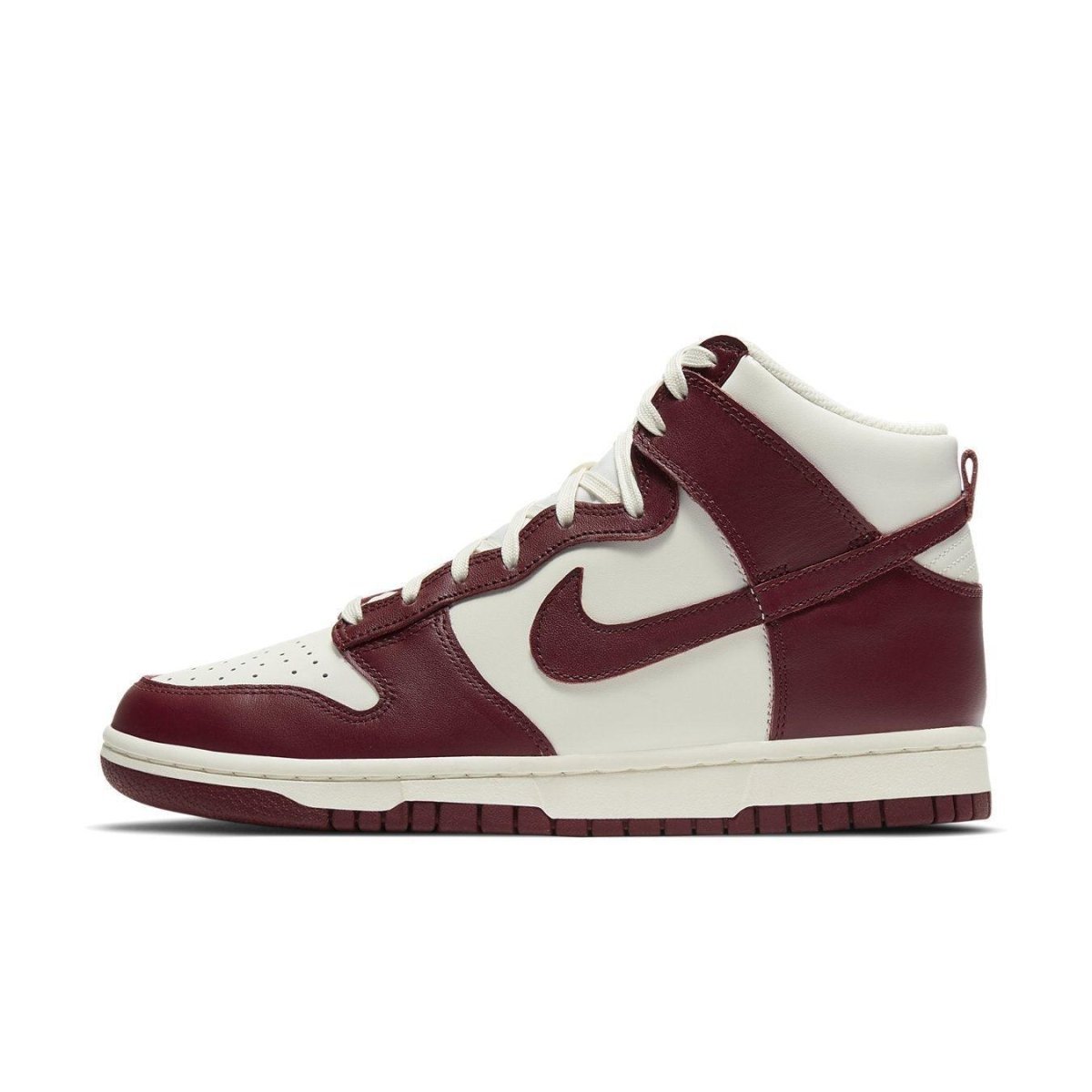 L'intersuola color panna e la tomaia in pelle biancastra di queste scarpe Nike Dunk High Team Red offrono un sottile contrasto con le sovrapposizioni in pelle rosso intenso.