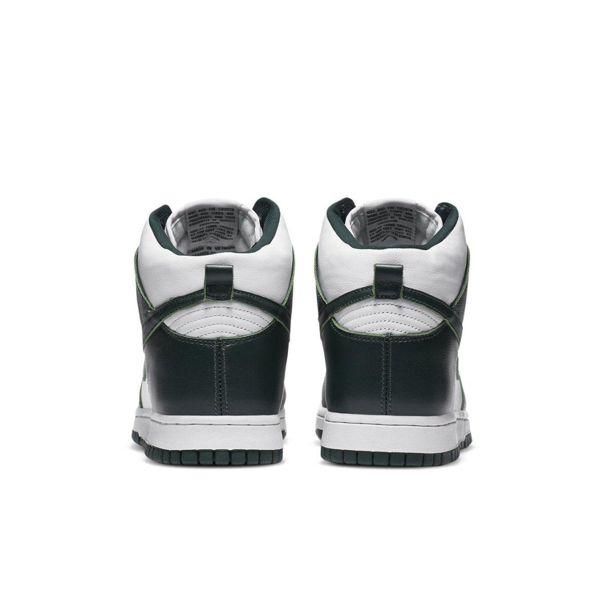 La Nike Dunk High SP "Spartan Green" ha una tavolozza bicolore semplicistica che ricorda la linea Be True to Your School del 1985. In questo esempio, il motivo bianco e verde su una tomaia interamente in pelle è ispirato allo stato del Michigan. La parte superiore ha una linguetta in rete per un comfort traspirante, oltre a un'etichetta Nike intrecciata per un look autentico. I calci sono stati rilasciati meno di una settimana prima del "Michigan" Dunk, completando il motivo della rivalità intrastatale.
