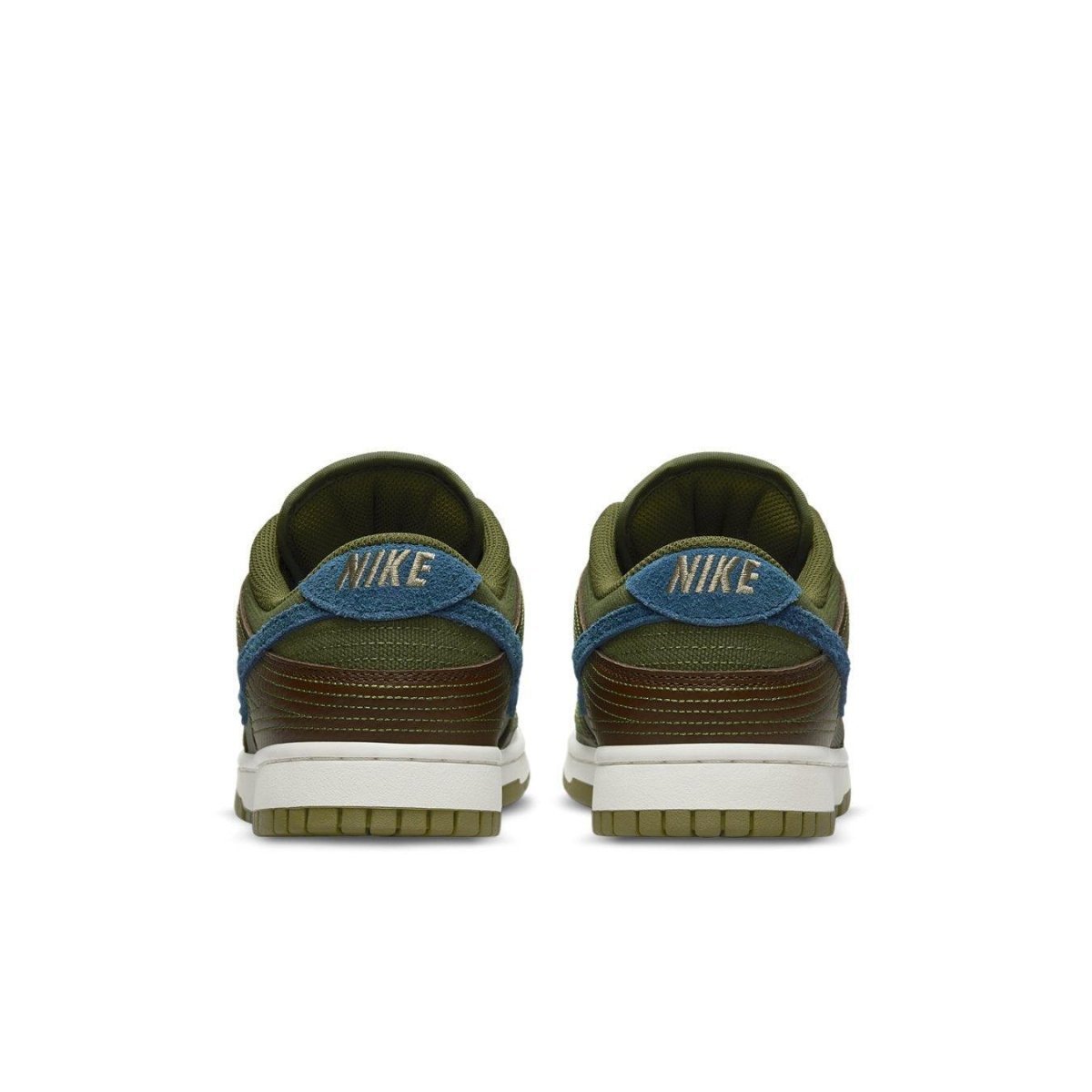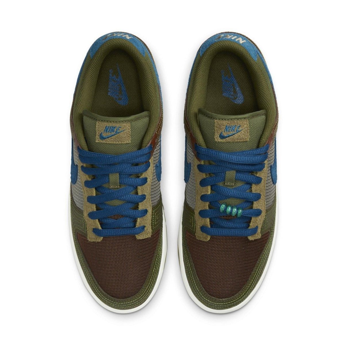Caratterizzata da una combinazione di colori Cacao Wow, Marina, Rough Green e Pilgrim, questa Dunk Low utilizza una miscela di rete e pelle, mentre una pelle scamosciata a pelo lungo appare sulle sovrapposizioni dell'occhiello, sull'etichetta della linguetta, sui loghi Swoosh e sul tallone. Successivamente, abbiamo cuciture a vista con gioielli in pizzo di perline e colore Sail sull'intersuola. Infine, una suola in gomma verde completa il look.