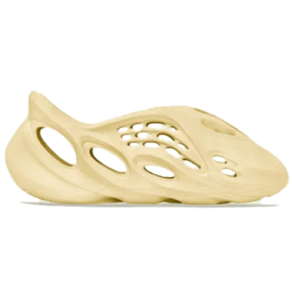 L'adidas Yeezy Foam Runner "Sulfur" ha una combinazione di colori beige giallastro in tutta la costruzione in schiuma EVA monopezzo, con prese d'aria strategicamente posizionate sulla tomaia e sui pannelli laterali per una ventilazione ottimale. Il plantare all'interno della slip-on ha una superficie ruvida che impedisce al piede di scivolare. L'unico marchio è "FOAM RNNR" impresso sul colletto interno e un logo adidas sulla suola sagomata, che ha un motivo di trazione ondulato per la massima aderenza.