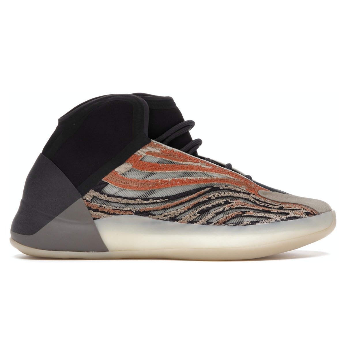 L'adidas Yeezy Quantum "Flash Orange" ha un'ariosa tomaia in mesh jacquard con sovrapposizioni nere e arancio bruciate a contrasto. Il mid-top è costruito con un colletto flessibile in neoprene e un puntale in pelle sintetica. Un tallone liscio continua fino all'intersuola, che è riempita con un'ammortizzazione Boost a tutta lunghezza racchiusa in una gabbia di gomma semitrasparente. La suola in gomma ha un tradizionale design a spina di pesce per una trazione stop-and-go.