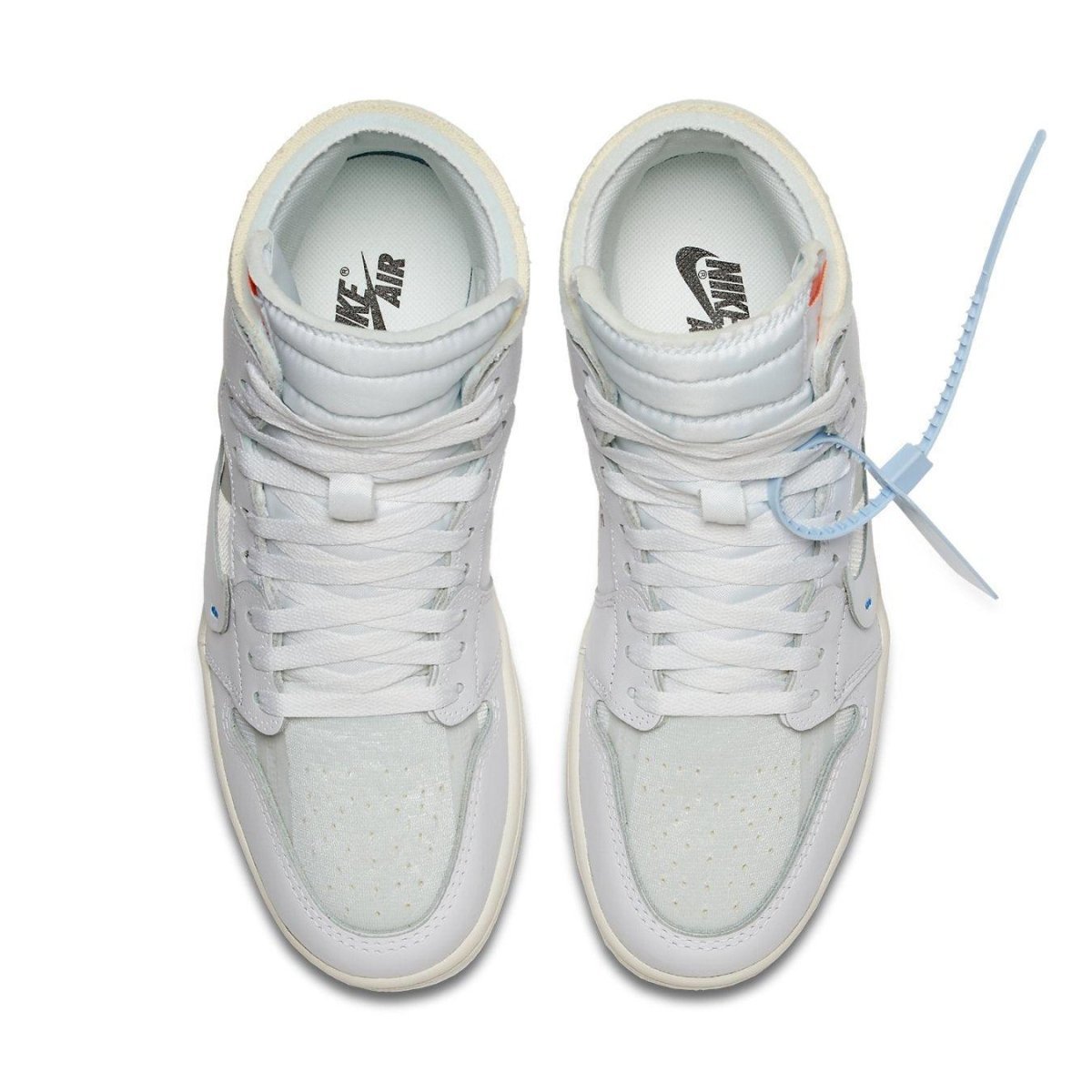 The characteristic insignia on the Off-White x Jordan 1 White are what make this collection so enticing. This features the "AIR" symbol along the midsole as well as the bright orange hits. Unlike the original design, this pair has a baby blue cable-tie.