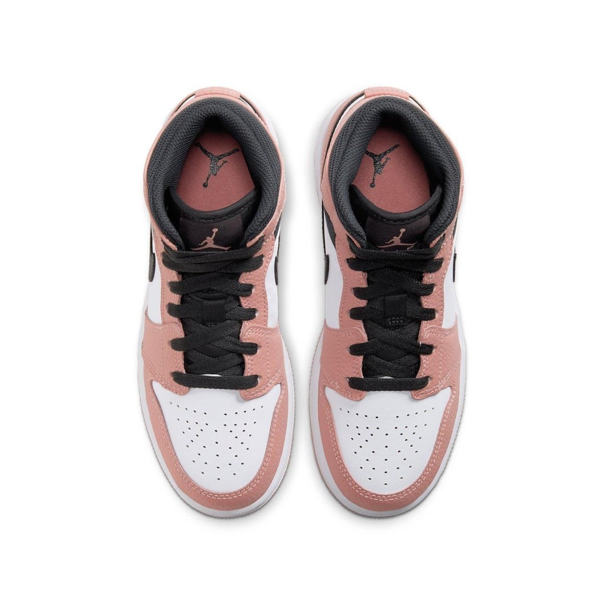 The Air Jordan 1 Mid GS "Pink Quartz" is a GS variant of one of the most popular shoes of all time. Pink Quartz leather is pebbled on the toe cap, collar, and heel of this relaxing shade. The perforated toe and mid-panel are set on a clean white leather basis. The Swoosh and Wings logos on the collar, for example, provide a vintage touch to the sneaker. The Air Jordan 1 Mid in grade school sizing has contrasting black cotton laces, a white midsole, and a bright pink outsole.