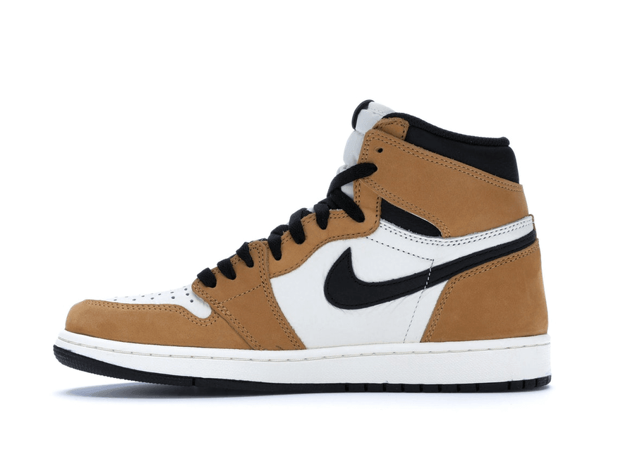 Michael Jordan è stato nominato NBA Rookie of the Year nel 1985 dopo aver iniziato la sua carriera con una media spettacolare di punti per partita e una passione per il successo. Jordan Brand ha commemorato l'occasione rilasciando la Air Jordan 1 Retro High OG "Rookie of the Year". La parte alta ha una tomaia in pelle bianca con fori per la ventilazione sulla punta e rivestimenti in pelle Gold Harvest su parafango, caviglia, occhiello e tallone. I richiami alla grande stagione da rookie di MJ sono nascosti all'interno di ogni cinturino della tomaia. '1984-85 R.O.Y. 2313 PUNTI 28.2 PPG' è scritto all'interno di un cinturino, mentre sull'altro è scritta una citazione Jordan.