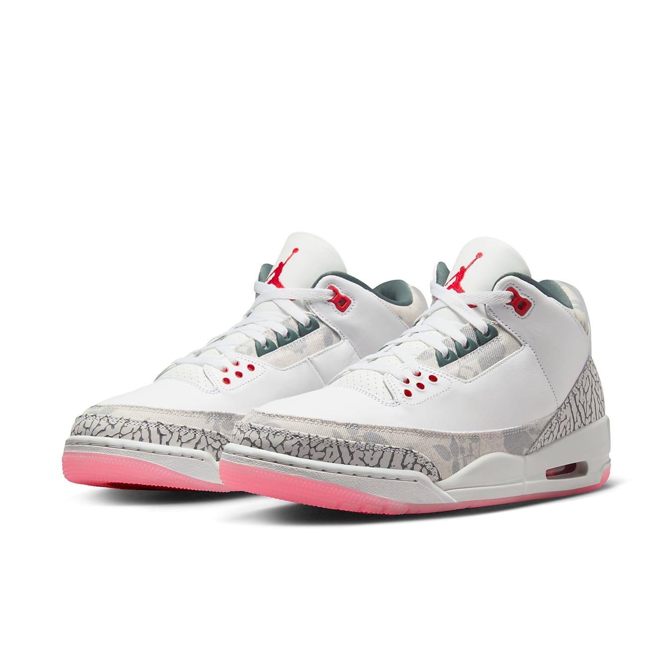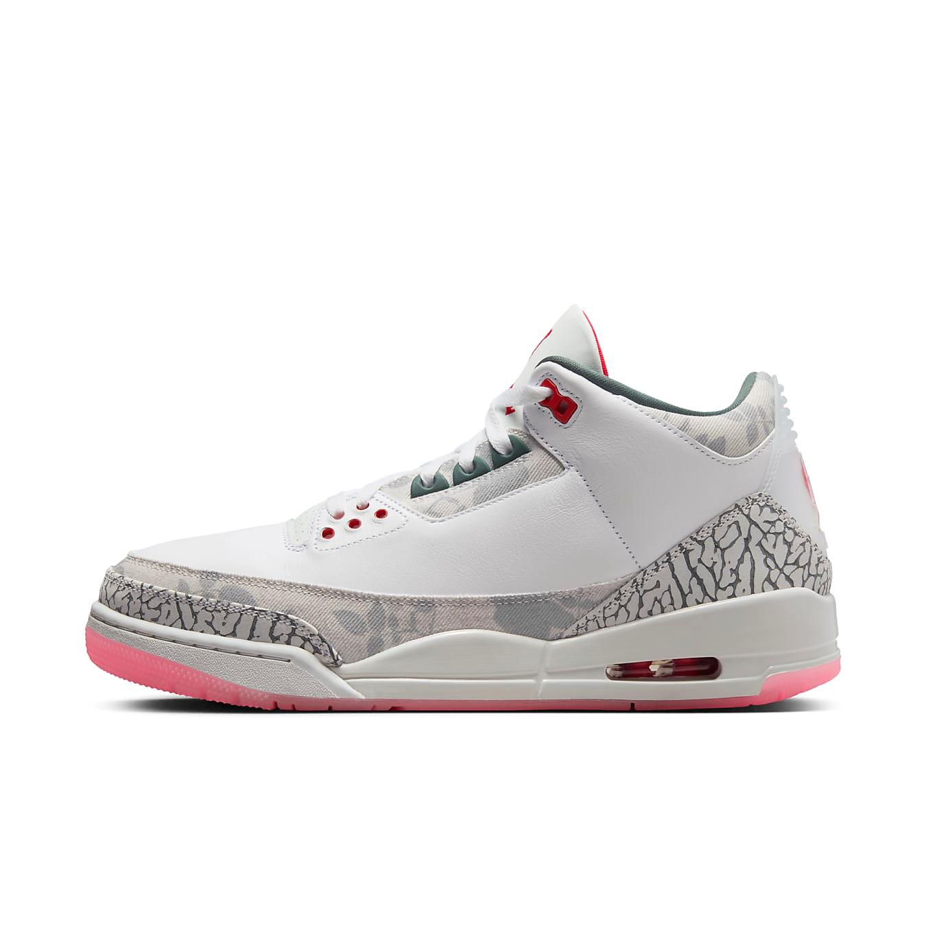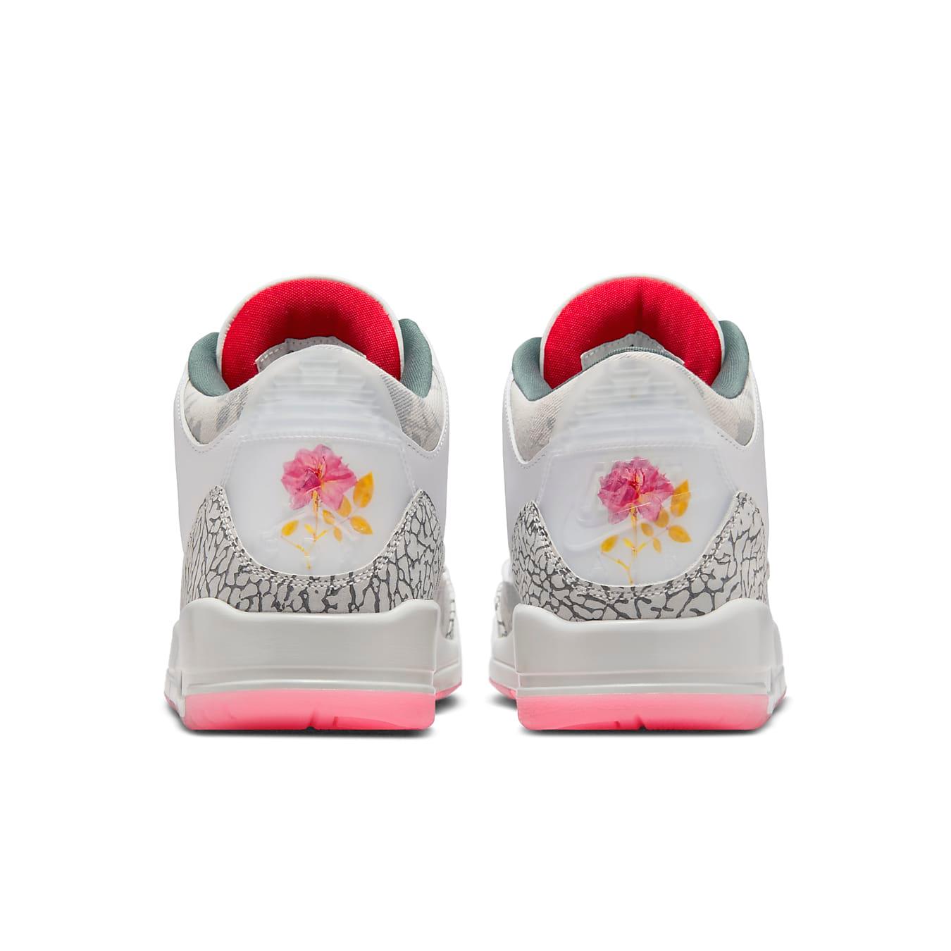 L'Air Jordan 3 Retro 'Wings' è una release in edizione limitata che celebra l'iniziativa Jordan Brand Wings, un programma globale di borse di studio lanciato nel 2015. Questa silhouette classica presenta una tomaia in pelle bianca, accentuata da occhielli cremisi e teal, con sovrapposizioni in stampa elefante grigia sull'avampiede e sul tallone. Il pannello centrale, il colletto e gli occhielli sono adornati con un tessuto twill con un delicato motivo floreale, aggiungendo un tocco unico al design. Sotto la linguetta posteriore traslucida si rivelano ulteriori dettagli floreali, insieme a marchi alternati Jumpman e Nike Air. Un Jumpman ricamato in rosso decora la linguetta, accompagnato da un'etichetta tessuta all'interno che recita: "Up, rose … I, too, have thorns." La sneaker è supportata da un'intersuola in poliuretano bianco con ammortizzazione Air-sole visibile nel tallone, mentre una suola in gomma traslucida con sfumature rosa garantisce una trazione durevole sotto i piedi.