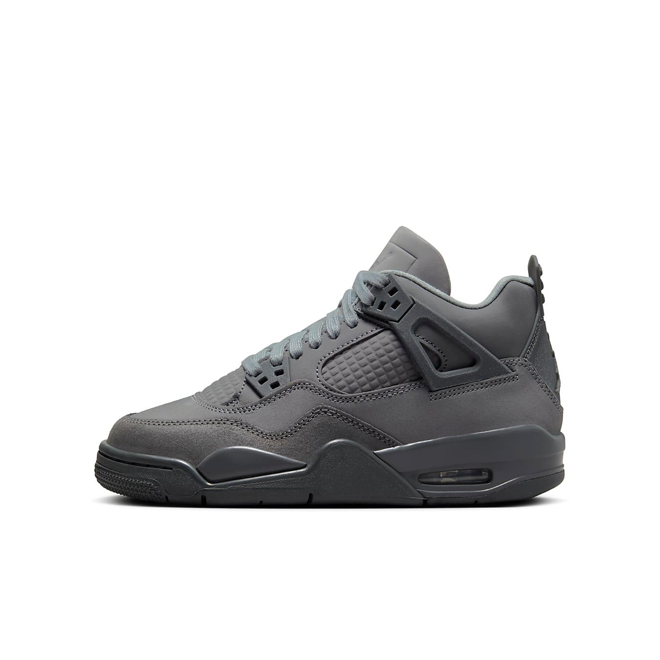 Disponibile nelle taglie per ragazzi, l'Air Jordan 4 Retro SE GS 'Wet Cement' trae ispirazione dalle strade acciottolate di Parigi, utilizzando diverse sfumature di grigio su una struttura in materiali misti composta da pelle, nabuk e suede. Il pannello laterale presenta un motivo a griglia in rilievo, mentre una leggera puntinatura arricchisce le ali di supporto in TPU e gli occhielli. Il classico marchio Jumpman adorna la linguetta e il tallone, mantenendo l'aspetto iconico. La sneaker è dotata di ammortizzazione leggera grazie a un'intersuola in poliuretano grigio scuro, completata da un'unità Air-sole visibile per un maggiore comfort e supporto.