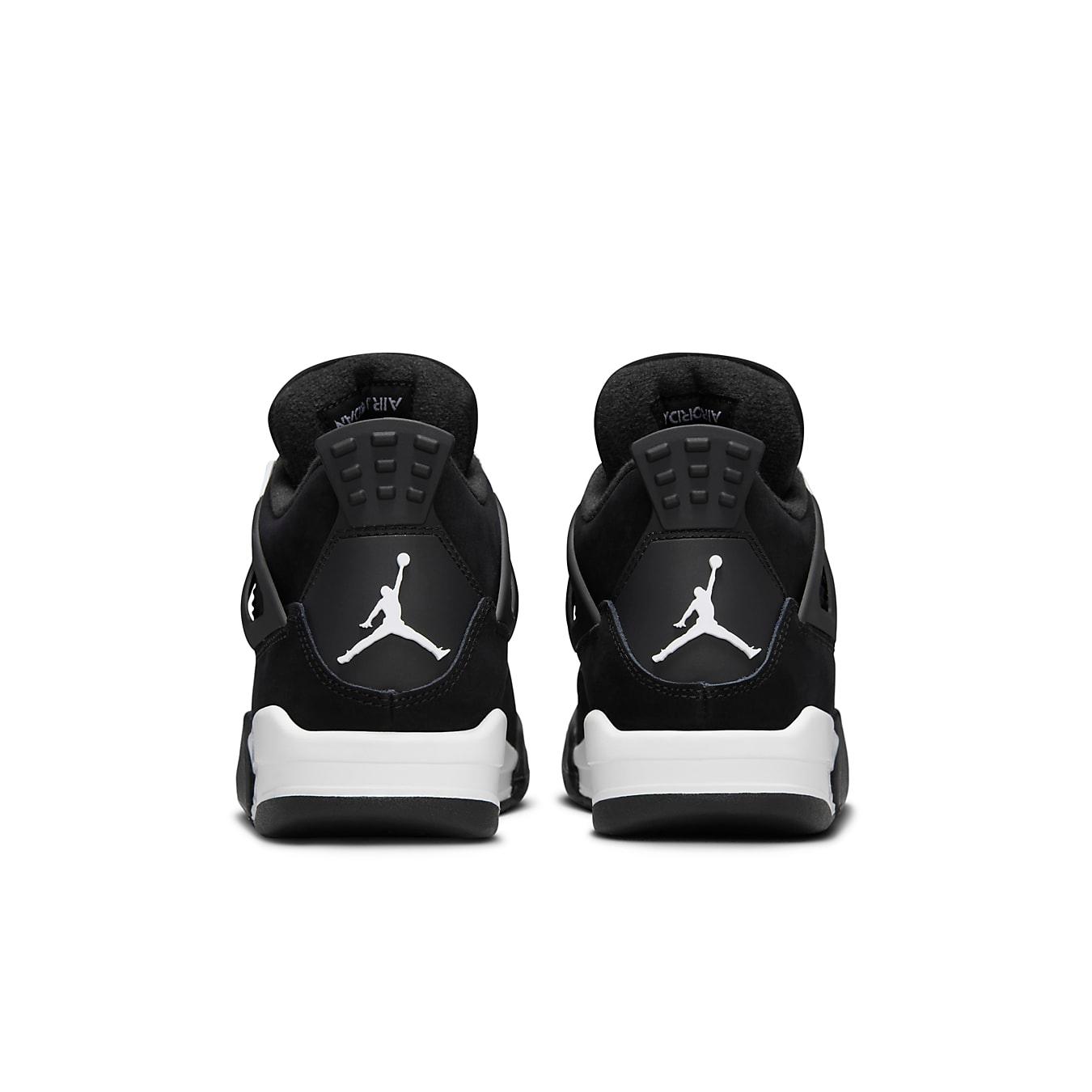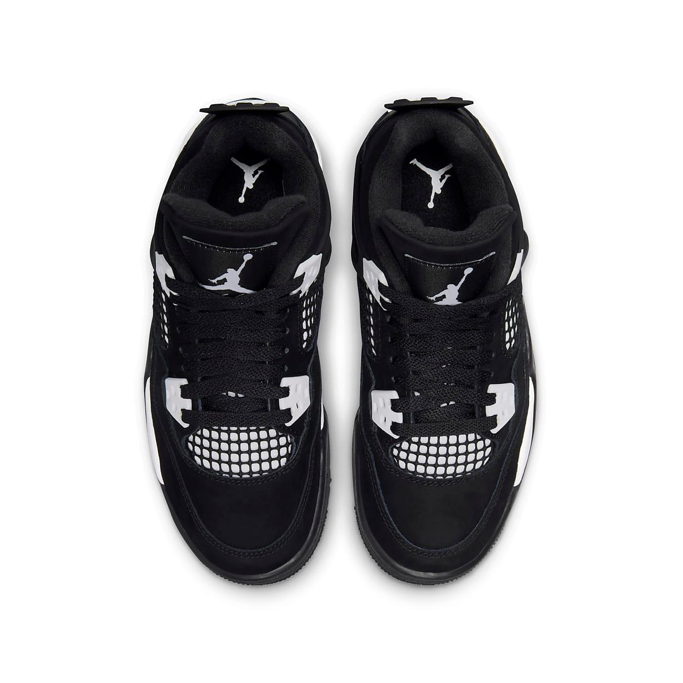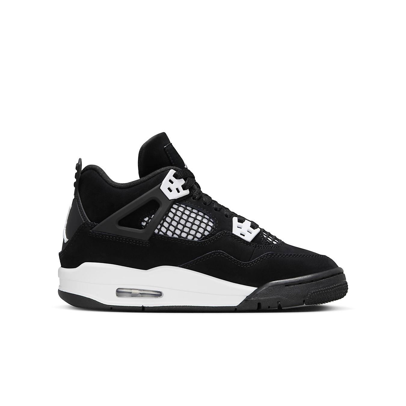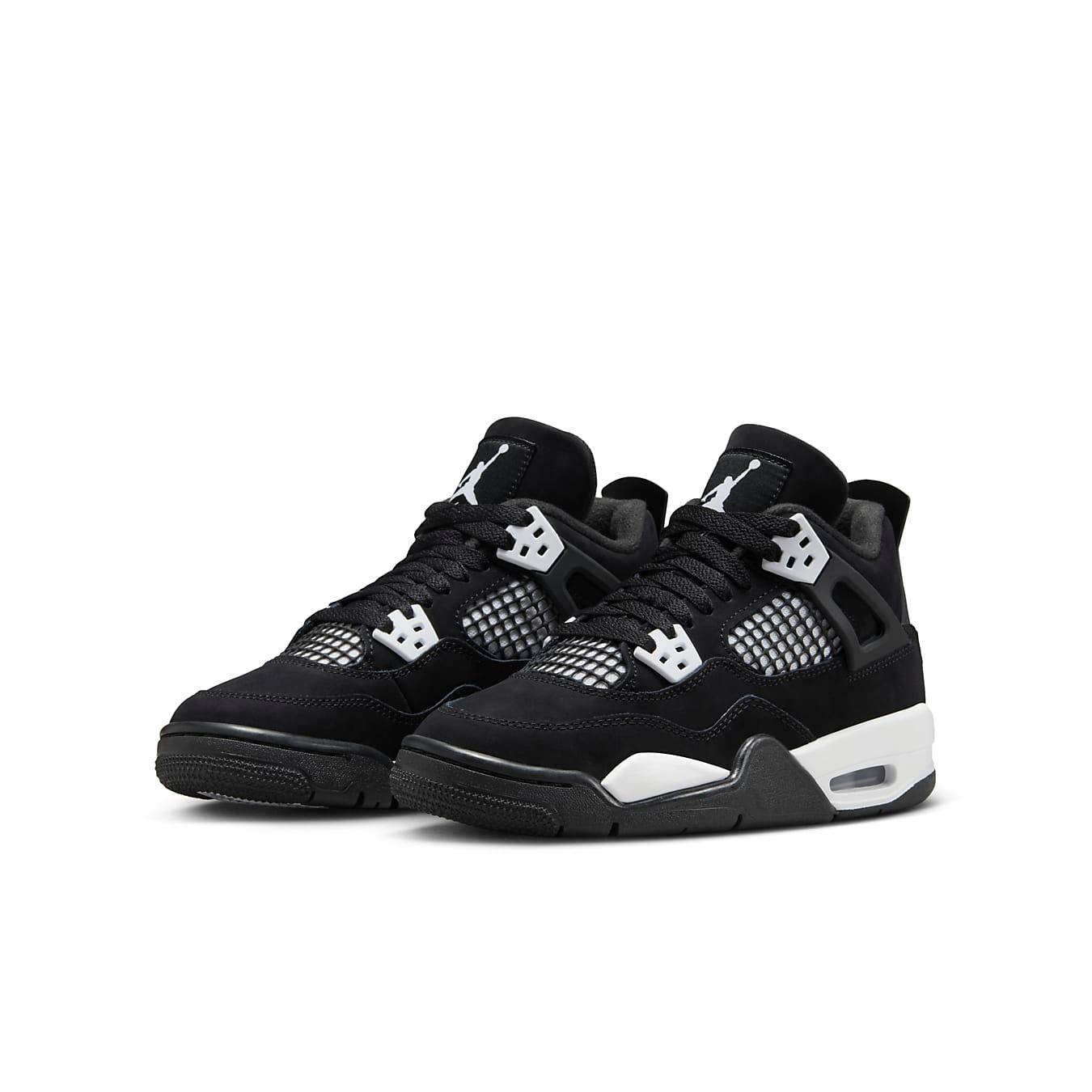 Progettata per ragazzi, l'Air Jordan 4 Retro GS 'White Thunder' presenta uno schema di colori che ricorda la release originale 'Thunder' del 2006. Questa silhouette classica è realizzata con una tomaia in nubuck nero, evidenziata da accenti bianchi a contrasto sul pannello laterale in mesh, sovrapposto da una rete nera, e occhielli in TPU modellati. Il branding Jumpman bianco è ben visibile sull'etichetta tessuta della linguetta e sul tallone, mantenendo l'aspetto iconico. La sneaker è supportata da un'intersuola in poliuretano bianco con ammortizzazione Air-sole visibile, offrendo sia comfort che stile.