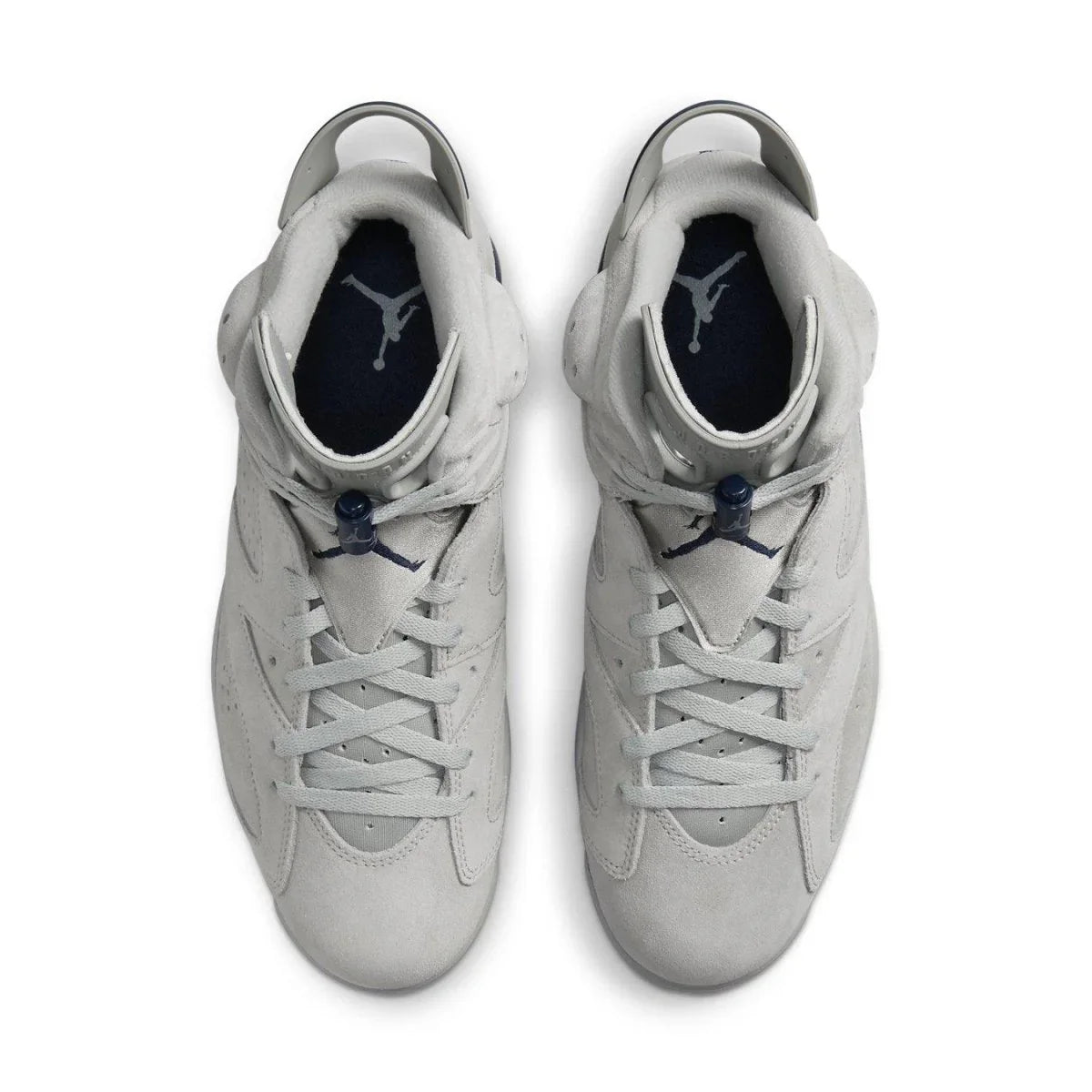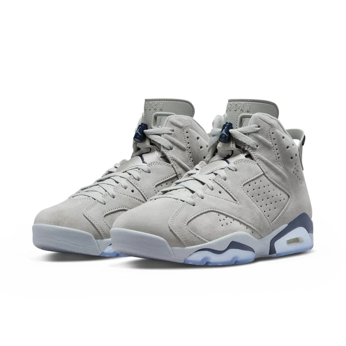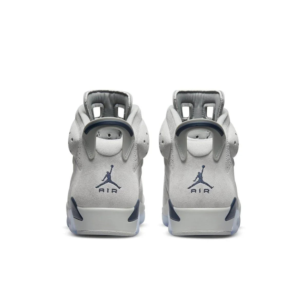 L'Air Jordan 6 Retro "Georgetown" mostra i colori distintivi degli Hoyas, la squadra che ha perso contro i North Carolina Tar Heels di Michael Jordan nella partita del campionato NCAA del 1982. La silhouette legacy utilizza una tomaia in pelle scamosciata grigia con dettagli traforati e una manica interna simile a Huarache. Gli accenti blu navy a contrasto si fanno strada verso la linguetta del tallone, i lacci e i colpi del marchio Jumpman ricamati sulla linguetta e sul retro del tallone. La sneaker poggia su un'intersuola in poliuretano bicolore, con un'unità Air-sole visibile nel tallone e una suola in gomma traslucida sotto il piede.