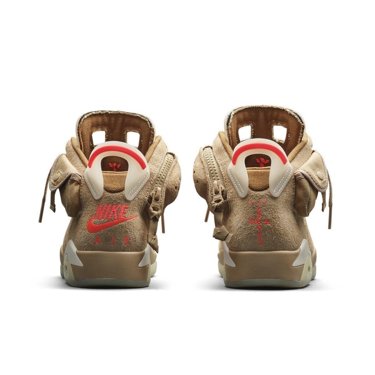 È una vera e propria sneaker da basket nel suo cuore, ma il rapper la veste con tomaia in suede color kaki britannico neutro, una tasca nascosta su ogni colletto e dettagli fosforescenti sulla linguetta e sulla suola. Le radici del modello sono ancora evidenti, tuttavia, con riflessi a infrarossi sul tallone, sull'unità Air e sul marchio disseminato dappertutto, ispirato alla colorazione originale dell'AJ6. Anche il logo è stato aggiornato per l'occasione, con lo Swoosh originale rimasto sul tallone sinistro e il moniker Cactus Jack di Scott che si unisce a destra.