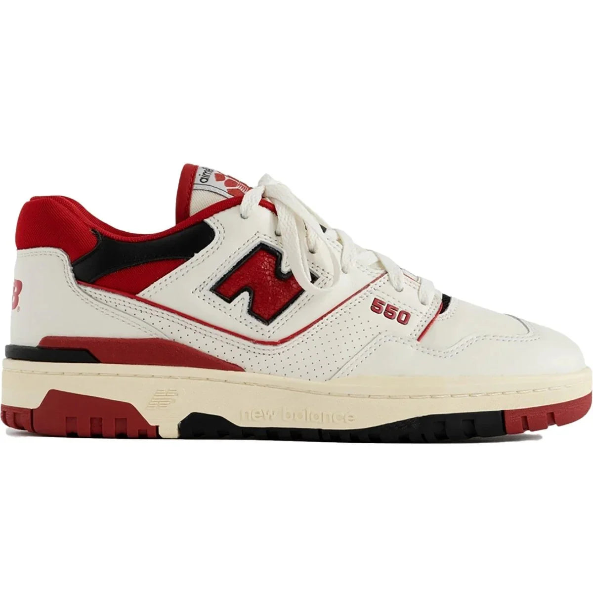Realizzate in collaborazione con il marchio di abbigliamento maschile con sede a New York, le Aimé Leon Dore x New Balance 550 'Red' fanno rivivere una scarpa da basket dimenticata tenuta fuori circolazione sin dalla sua uscita originale nel 1989. Una tomaia in pelle bianco sporco è ravvivata da un rosso a contrasto e accenti neri ovunque, incluso un logo "N" in pelle screpolata sul pannello laterale. Il marchio Aimé Leon Dore si trova su entrambe le linguette e sulla sovrapposizione del tallone della scarpa sinistra. Un'intersuola pre-ingiallita amplifica il look vintage.