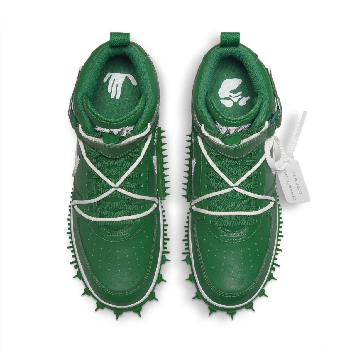 La Off-White x Nike Air Force 1 Mid SP Leather "Pine Green" continua l'eredità creativa di Virgil Abloh con gli svolazzi distintivi del designer. La tomaia in pelle verde è fissata con lacci standard e un sistema di allacciatura secondario che passa attraverso una serie di cavi Flywire esposti. Gli Swoosh bianchi a contrasto sono impreziositi da cuciture a zigzag tono su tono e da una linguetta arancione rettangolare sul lato laterale. "AIR" è ricamato sulla linguetta, mentre la grafica non corrispondente sul tallone laterale abbina un candelabro a un marchio "OFF". Tinta di arancione, un'unità Air-sole visibile è incastonata nel tallone dell'intersuola bianca, accentuata da una linea superiore ondulata e supportata da una suola in gomma a spillo.