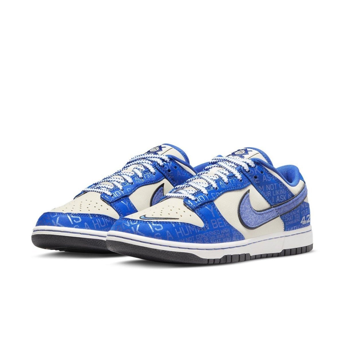 Le Nike Dunk Low "Jackie Robinson" celebrano il 75° anniversario di un momento sportivo epocale. Il 15 aprile 1947, Jackie Robinson infranse la barriera dei colori del baseball facendo il suo debutto in major league con i Brooklyn Dodgers. I colori della squadra sono rappresentati dalla tomaia in pelle della scarpa, caratterizzata da una base bianco sporco con sovrapposizioni blu reale. Quest'ultimo è inciso con le citazioni ispiratrici di Jackie, mentre il numero di maglia dell'atleta è stampigliato sul tallone laterale. Ulteriori dettagli unici includono lacci cuciti, Swoosh in feltro e un'etichetta della linguetta del 75° anniversario.