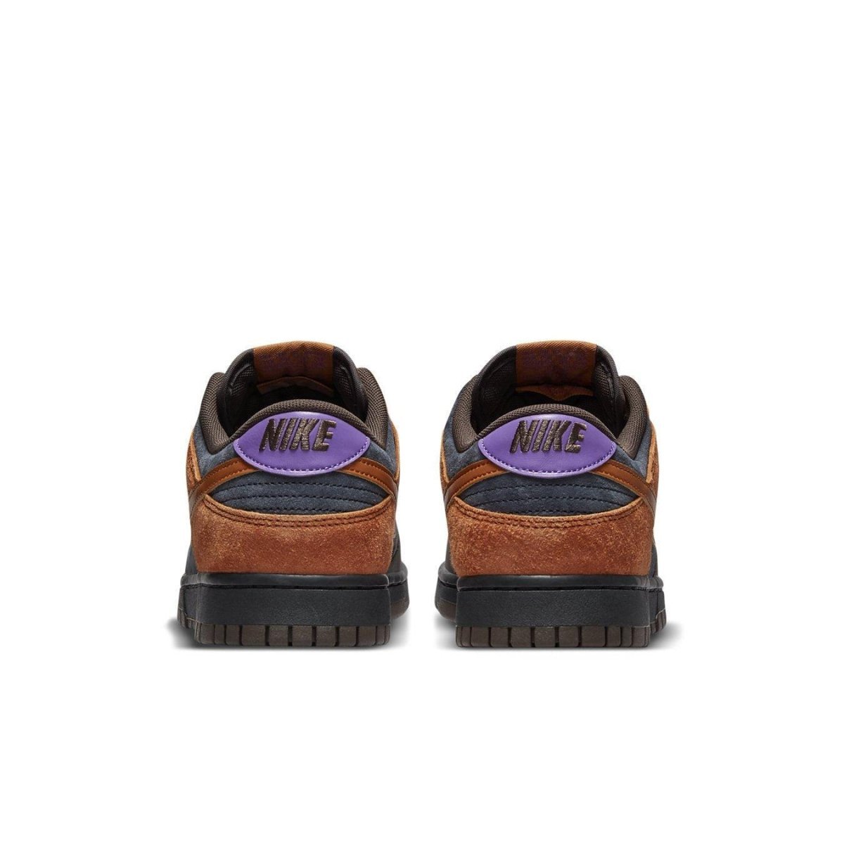 La scarpa ha pelle scamosciata arancione bruciata a caldo sulla punta traforata e sul cinturino laterale posteriore. Questo è ben compensato da un involucro di pelle marrone setosa attorno alla punta e attorno al pannello degli occhielli. Al centro riappare il morbido suede, questa volta in una tonalità decisa di un vivido grigio-blu. La linguetta in tessuto è arancione, mentre i lacci, i dettagli del colletto in tessuto e la suola esterna in gomma sono marroni. La sneaker Nike Dunk Low Cider PRM ha un'intersuola in gomma nera liscia e una linguetta sul tallone viola brillante per completare il design drammatico.