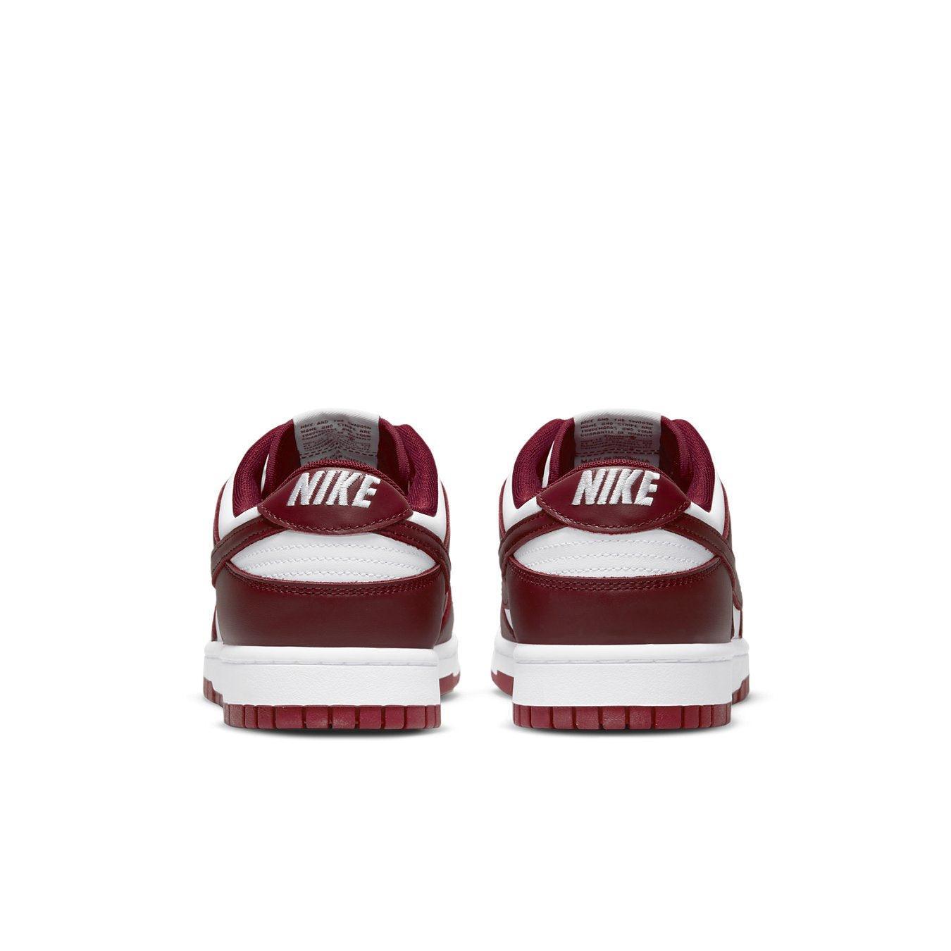 La Nike Dunk Low "Team Red" ha il classico color blocking che ricorda la prima serie "Be True to Your School" della scarpa del 1985. La tomaia interamente in pelle ha una base bianca con sovrapposizioni rosso bordeaux su punte, tallone e occhiello . Un'etichetta Nike tessuta è cucita sopra una linguetta in nylon ventilato e la linguetta sul tallone è ricamata con il tradizionale marchio Nike. La sneaker è costruita su una robusta suola in gomma e una suola aderente progettata per il legno duro.