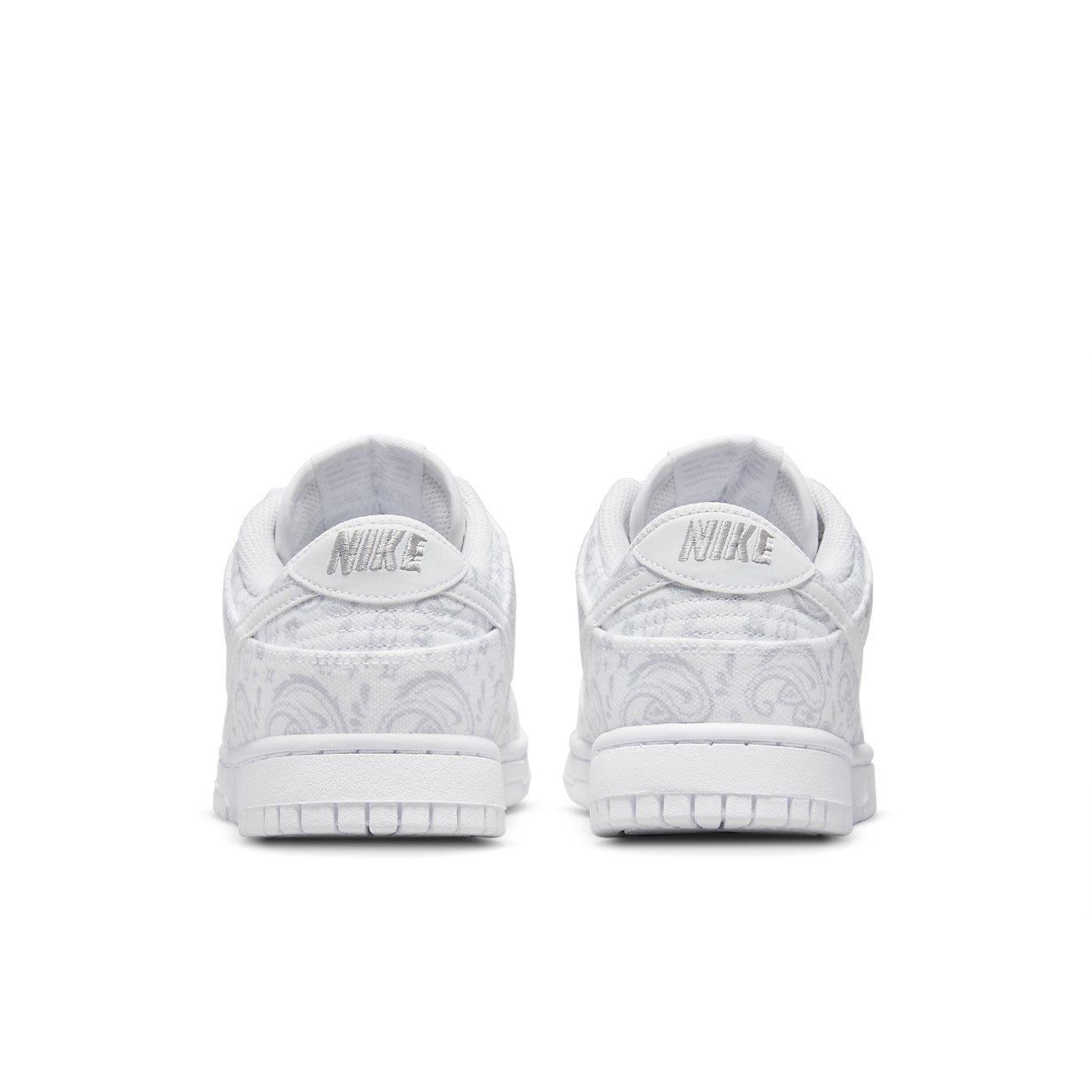 La Nike Dunk Low White Paisley presenta una tomaia in tela bianca che è completata da un motivo Paisley grigio chiaro che copre l'intera silhouette. Lo swoosh laterale e la linguetta sul tallone sono realizzati in pelle bianca. La classica suola bianca ha una suola bianca che si abbina al resto della silhouette e completa il look originale.