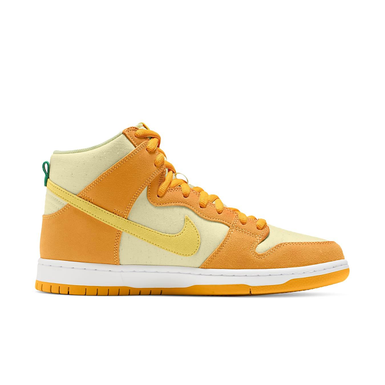 Parte del Nike SB Fruit Pack del 2022, la Nike SB Dunk High 'Pineapple' si distingue per la sua tomaia in pelle screpolata giallo pallido, completata da sovrapposizioni in suede giallo dorato e vivaci Swoosh gialli. Aggiungendo un tocco giocoso, la parte interna della linguetta presenta un'etichetta tessuta raffigurante un personaggio di ananas in stile cartone animato. Il design è completato da una suola con ammortizzazione Zoom Air, che offre comfort e supporto.