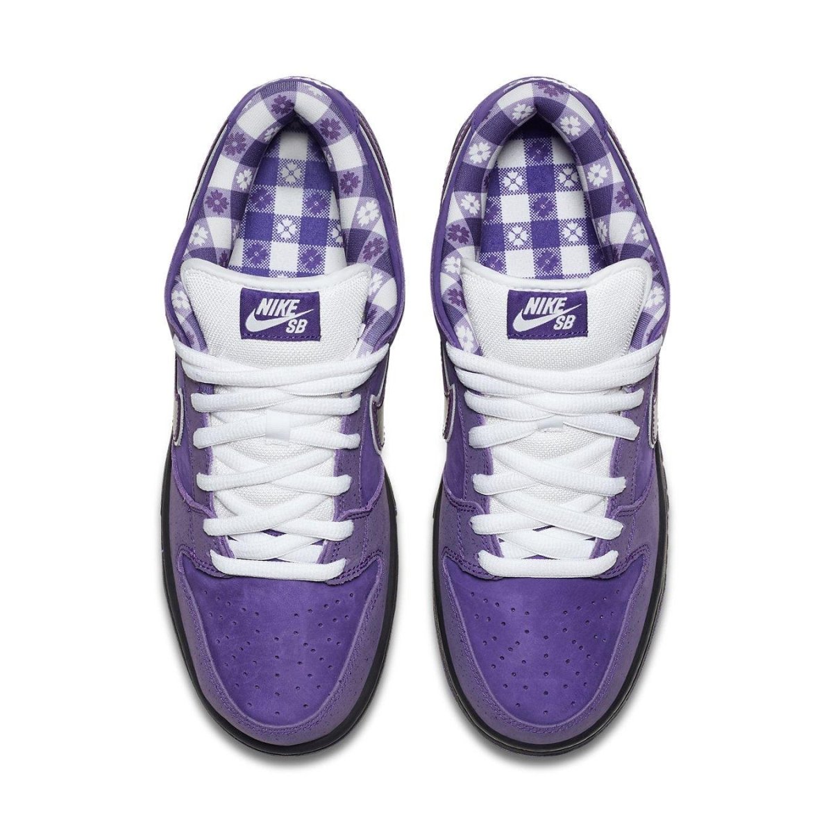 Concepts e Nike SB tornano di nuovo all'opera, con una nuova iterazione dell'ispirazione "Lobster". La Dunk Low Premium SB 'Purple Lobster' è simile alle tre esecuzioni precedenti, ispirandosi ad esemplari dai colori strani presenti in natura a causa di anomalie genetiche che fanno apparire il loro esoscheletro in diverse tonalità, come il giallo, il blu e il viola. I dettagli speciali includono un motivo scozzese rosso e bianco sulla fodera e una fascia elastica avvolta attorno all'avampiede in modo simile a come vengono fissate le chele di aragosta.