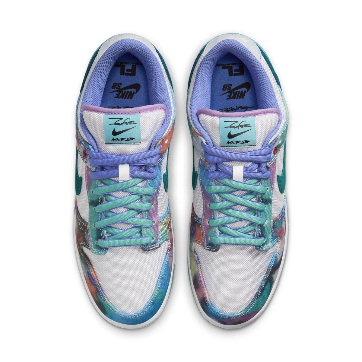 La Futura Laboratories x Nike Dunk Low SB 'Bleached Aqua' presenta uno Swoosh in suede color teal scuro su una tomaia in tela bianca, arricchita da sovrapposizioni in tela multicolore adornate con l'arte astratta di Futura. La firma dell'artista è elegantemente incisa sul tallone laterale, mentre il logo FL è ben visibile sul lato mediale. Un'etichetta tessuta co-branded decora la linguetta imbottita, aggiungendo un tocco di branding collaborativo. Completando il design, una suola in gomma traslucida con sfumature blu assicura un'eccellente trazione e durata.